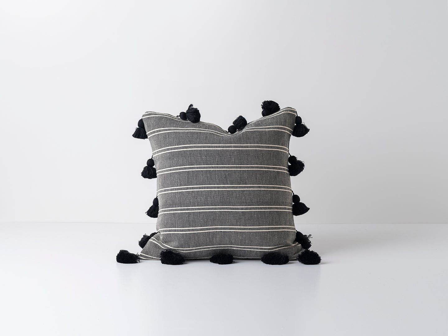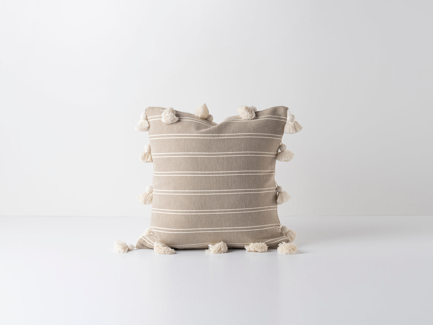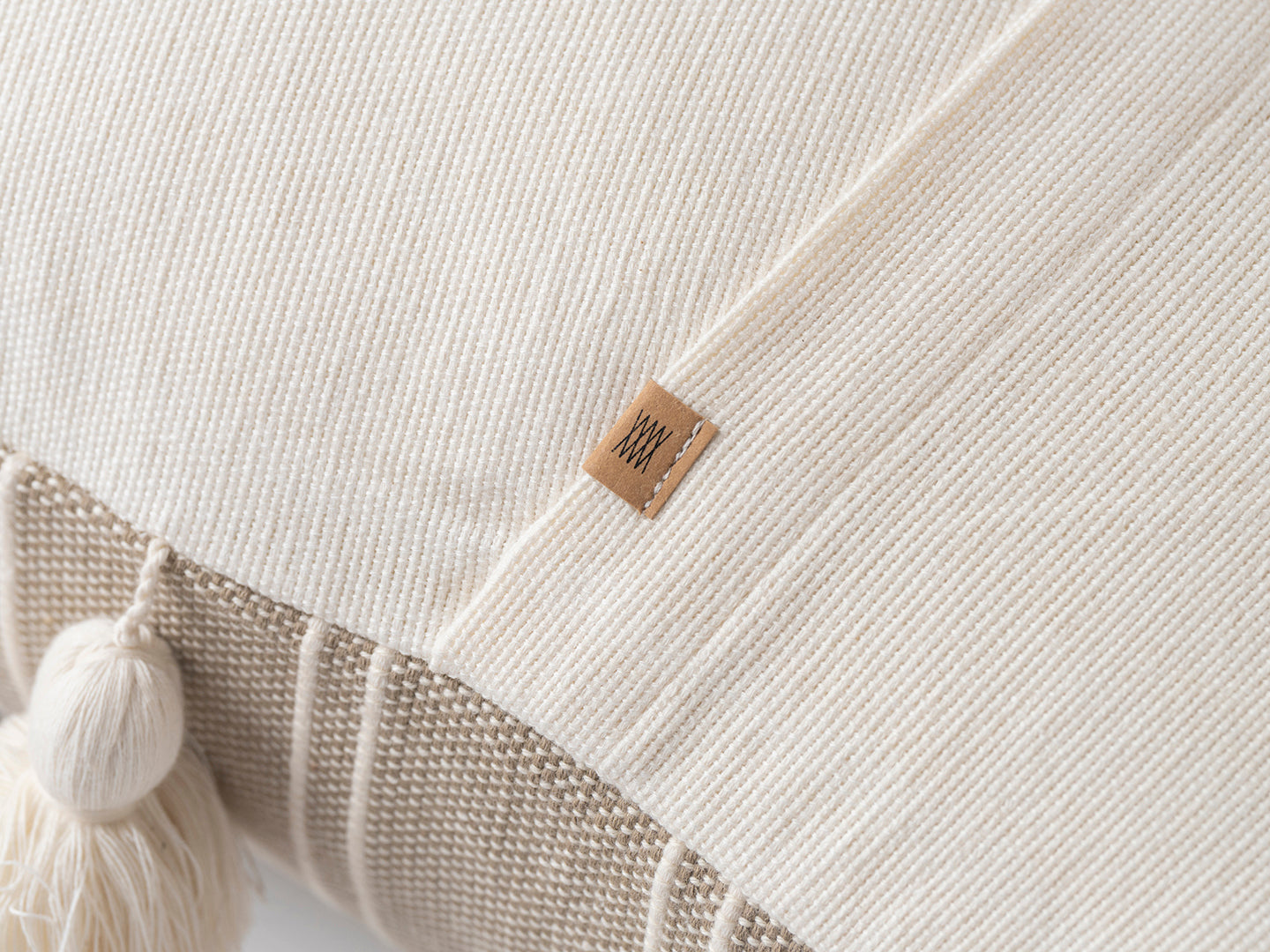 Tejida en telar de pedales con 100% algodón peinado en Pátzcuaro, México, esta funda para cojín terminada con suaves pompones será el detalle más lindo y juguetón de tus espacios. Su cerrado tipo sobre ayuda a mantener la almohada en su lugar.